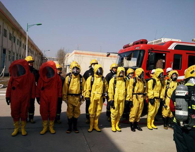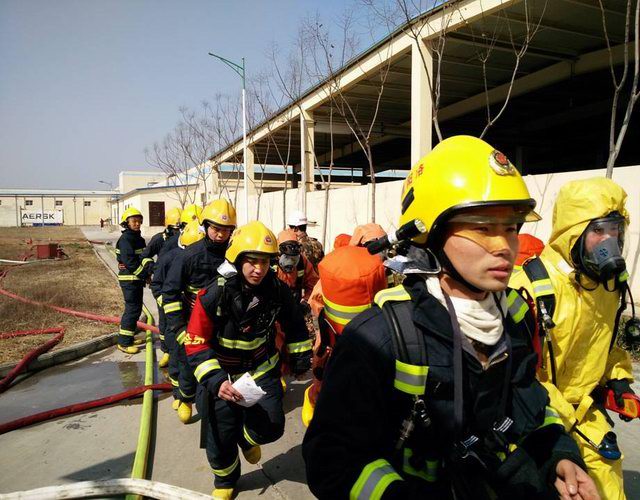 洛陽市消防支隊王榮范參謀長、西工區(qū)消防大隊劉學(xué)康大隊長及洛陽正大總裁辦喬光斌總經(jīng)理、食品事業(yè)部杜光輝副總經(jīng)理一行在演練前到達演練場地進行安排部署,成立了消防演練現(xiàn)場指揮部,由洛陽市消防支隊王榮范參謀長任指揮長。演練假設(shè)正大食品有限公司制冷機房因設(shè)備發(fā)生故障,液氨罐發(fā)生泄漏,1名操作人員受困,現(xiàn)場人員立即向公司領(lǐng)導(dǎo)匯報并撥打119尋求支援。119指揮中心在接到報警后,由洛陽市消防支隊協(xié)調(diào),迅速調(diào)集澗西消防大隊下屬谷水中隊,西工區(qū)消防大隊下屬車站中隊、紅山中隊迅速趕赴現(xiàn)場,與此同時正大食品有限公司迅速啟動單位應(yīng)急預(yù)案,組織員工疏散。十五分鐘后,紅山消防中隊6臺消防車、2臺救護車到達現(xiàn)場,消防戰(zhàn)士著防化服立即進入現(xiàn)場,對氨中毒人員進行搶救,對氨泄漏部位進行應(yīng)急處置。二十分鐘后谷水中隊、車站中隊6臺消防車達到現(xiàn)場支援, 50余名消防員展開救援戰(zhàn)斗,用消防水槍噴水中和泄漏的氨氣,降低空氣中氨的濃度。經(jīng)過近一個小時的搶維修,氨泄漏得到控制,演練指揮中心宣布本次演練***結(jié)束。