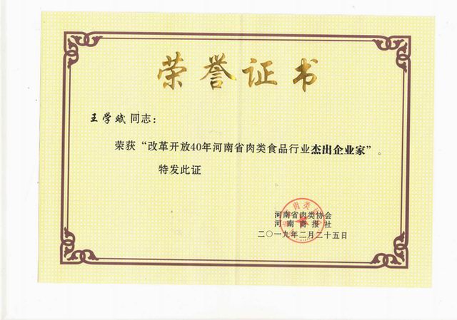 榮譽‖洛陽正大獲評改革開放40年河南肉類食品行業(yè)強勢企業(yè)、王學斌***總裁榮獲改革開放40年河南肉類食品行業(yè)杰出企業(yè)家