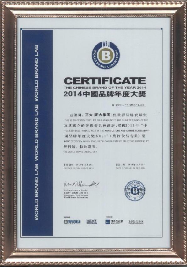2014年12月29日,“總裁世界年會(huì)”在北京東方君悅大酒店舉行。本次大會(huì)揭曉了享有“中國(guó)品牌奧斯卡”之稱的 “世界品牌實(shí)驗(yàn)室2014年中國(guó)品牌年度大獎(jiǎng)”評(píng)選結(jié)果,正大集團(tuán)、中國(guó)國(guó)航、國(guó)家電網(wǎng)、騰訊控股、中國(guó)人壽、中國(guó)國(guó)旅、北汽集團(tuán)、華為技術(shù)、長(zhǎng)虹電器等30個(gè)活躍在中國(guó)經(jīng)濟(jì)舞臺(tái)的領(lǐng)軍品牌榮獲 “中國(guó)品牌年度大獎(jiǎng)”,正大集團(tuán)以在農(nóng)牧食品業(yè)多年的探索實(shí)踐和管理經(jīng)驗(yàn),以及良好的產(chǎn)品品質(zhì)和品牌知名度,榮獲農(nóng)牧食品行業(yè)“中國(guó)品牌年度大獎(jiǎng)***”榮譽(yù)稱號(hào)。哈佛商學(xué)院教授約翰?戴騰博士(John Deighton)、耶魯大學(xué)管理學(xué)院教授萊維·多爾博士(Ravi Dhar)分別進(jìn)行頒獎(jiǎng)及致詞。